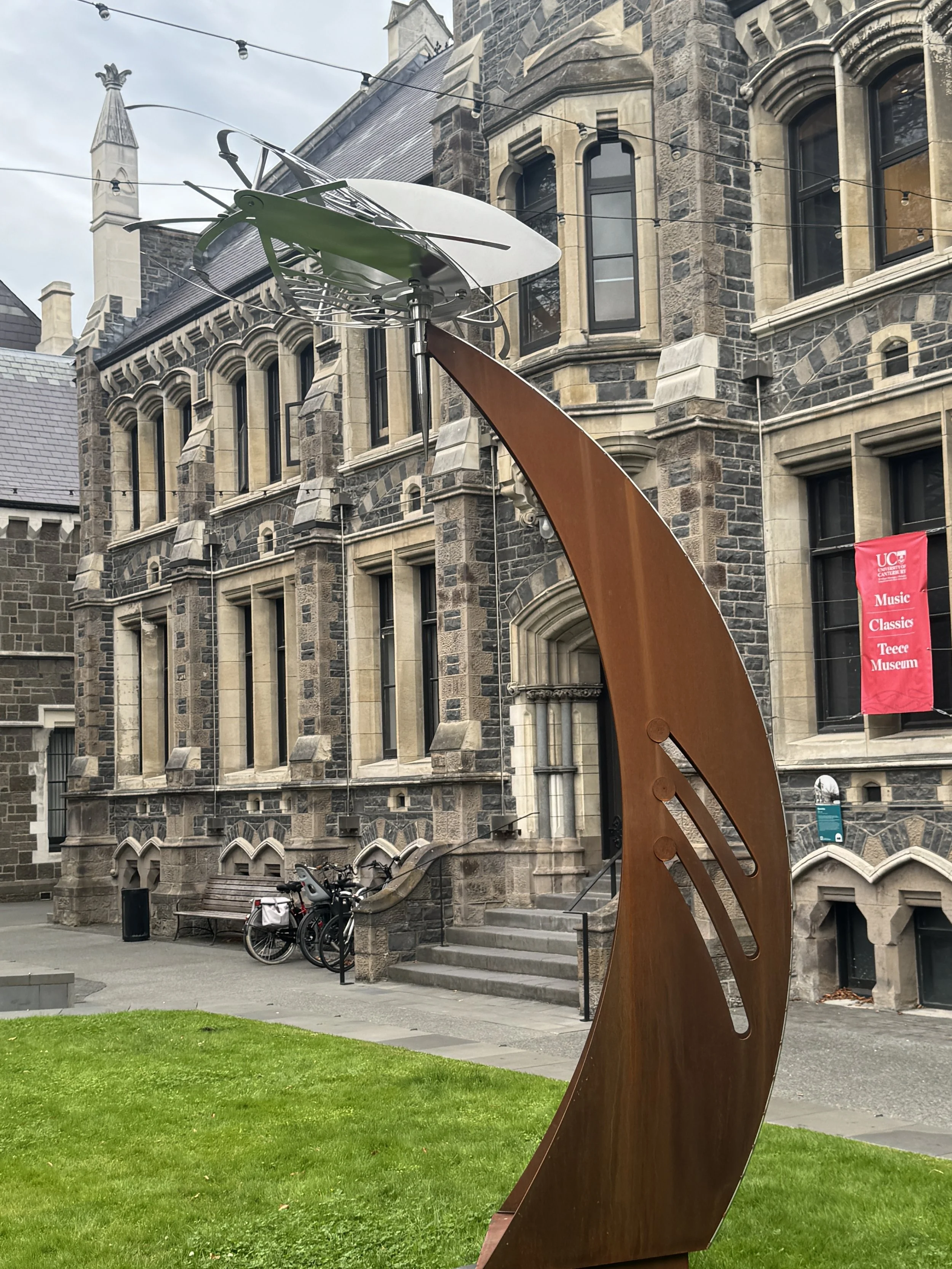 And then outside the Arts Centre in Christchurch, we saw a sculpture by Graham Bennett called The Widening Gyre. The piece is a response to the slowing of the Antarctic Circumpolar Current — the world's largest ocean current, linking every ocean, moving millions of cubic metres of water per second. It is slowing because of climate change. Scientists project a 40% weakening of deep ocean circulation by the 2050s. For New Zealand, that means fisheries disrupted, El Niño and La Niña cycles intensifying, sea levels rising faster, and coastal communities already measuring what they stand to lose. New Zealand is the country closest to the gyre. The effects are not distant. They are geological, oceanic, and above all for residents, intimate.